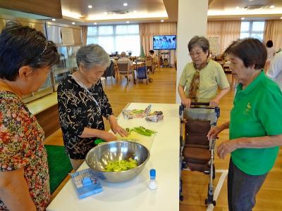 夏野菜の美味しい季節になりました。フラミンゴ農場でとれた野菜 を利用者と一緒に漬物にしました。 漬物はその日の昼食と一緒に出され美味しくいただきました(*'-'*)