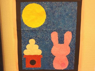 本日、中秋の名月で利用者様等が手掛けていました貼り絵がピタリ