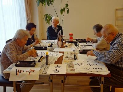 定例の書道教室は今日も盛んです、、、筆を握って精神統一、皆さん