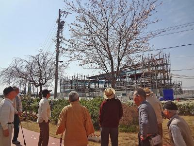 フラミンゴの、庭の桜が開花しました。利用者の皆様方で散歩を しながらの花見です。 うららかな陽光に春の訪れを感じることが出来ました、、、 桜越しに老人ホームの建設中の姿が見えます。こちらは初夏の オープンを目指して着々と準備が進行しています。