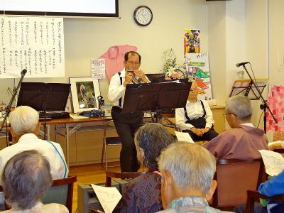童謡を量感たっぷりに演奏して、利用者の皆さんもそれに合わせ