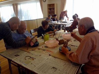 外部講師を招いての陶芸教室は希望者殺到で順番にご利用頂く ほどの人気です。さて今日のテーマは何でしょうか?・・・ その後ろでは書道教室も開催されていますね。皆さん真剣に取 り組んでおられます。