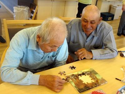 お二人で協力して動物パズルを完成させました。似た色のピース