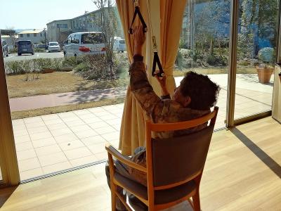 ゆっくり庭の景色を見ながらマイペースでリハビリマシンの運動を