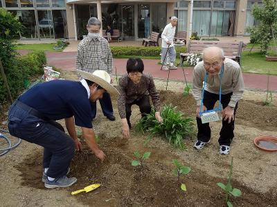 利用者の皆さんで「オクラ」と「きゅうり」と「ナス」を植え