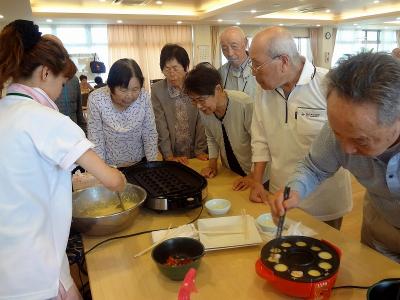 今日はレクでタコ焼きパーティーの開催です。皆さん自身で作っ
