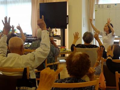 いつもの個別リハビリテーションとは別に、利用者の皆さんに集 まって頂き、理学療法士による運動指導が行われました。 皆さん真剣に話を聞かれて取り組まれていましたよ。