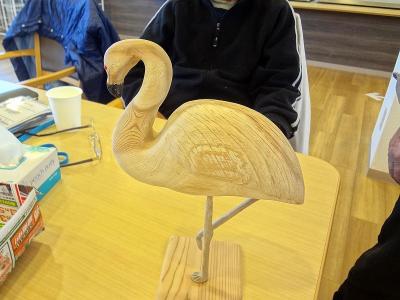 利用者様が製作したフラミンゴの木彫り作品です。