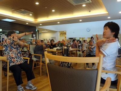 当院理学療法士による全員を対象としたリハビリ体操の風景です。