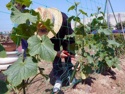 お天気も良く、フラミンゴ農園で育てたキュウリの初収穫となり