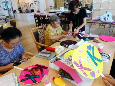 今月末のKYKライブの為に新しく大きな応援うちわを作ってい ます。折り紙教室をいつもご利用されている利用者様等がとても 手際よく、キレイにカッコよく作って下さいました。