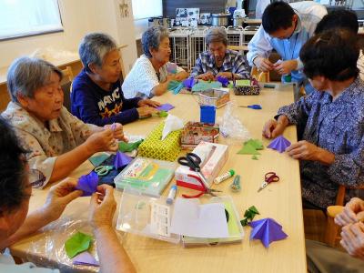 子供の頃に楽しんだ折り紙遊びを想い出しながら、仲の良い利用 者様が集まってくつろぎタイムです。でも手先の作業は脳の活性 化にはとっても効果があるとのことですからこれも立派なリハビ リテーション!!