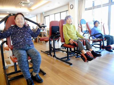フラミンゴの一番の目玉はプールウォーキングなのは言うまでも ありませんが、皆さん自分のリハビリ処方(個人カード)に沿って 朝から精力的にリハビリマシンをこなしていきます。 陽光の中で元気が輝いていますね!!