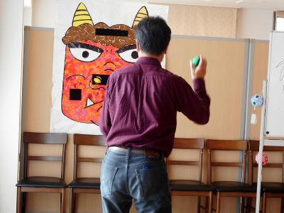 大きな鬼の的をめがけてボールを投げて特典を競い合います!
