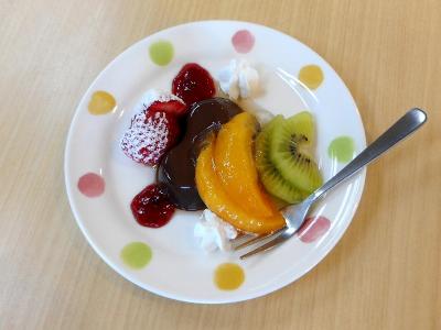 フラミンゴでは旬の行事毎に、レクはもとより食事やおやつが とても楽しみな一日になります。ランチも遊び心満載でしたが 3時のおやつも得意の手作りスイーツが登場しました!! ハート型チョコムースのフルーツ添えに大満足ですヽ(^◇^*)/