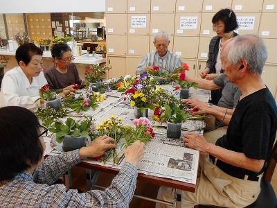 外部講師による文化教室の中でも「生け花教室」はとても人気 の講座ですね。暫く前からご覧のように男性陣の参加が増えて 来ています。活発なリハビリ運動と並んで情緒風情豊かな空間 も同居する贅沢な毎日を楽しんで頂いてます。